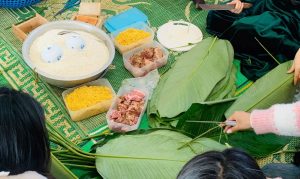 Khép lại chuỗi hoạt động văn hóa là bữa tiệc ẩm thực đầy màu sắc. Trong không gian ấm cúng, các bạn cùng nhau thưởng thức thành quả của mình cùng những món ngon đặc trưng như: Bánh chưng, bánh giò, nem rán, giò lụa, dưa hành muối… Vị đậm đà của nem rán hòa cùng vị dẻo thơm của nếp mới tạo nên một dư vị Tết khó quên, khiến khoảng cách địa lý giữa hai quốc gia như bị xóa nhòa.