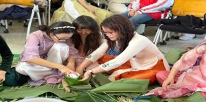 Lưu học sinh trải nghiệm hoạt động gói bánh chưng và làm nem truyền thống của người Việt Nam
