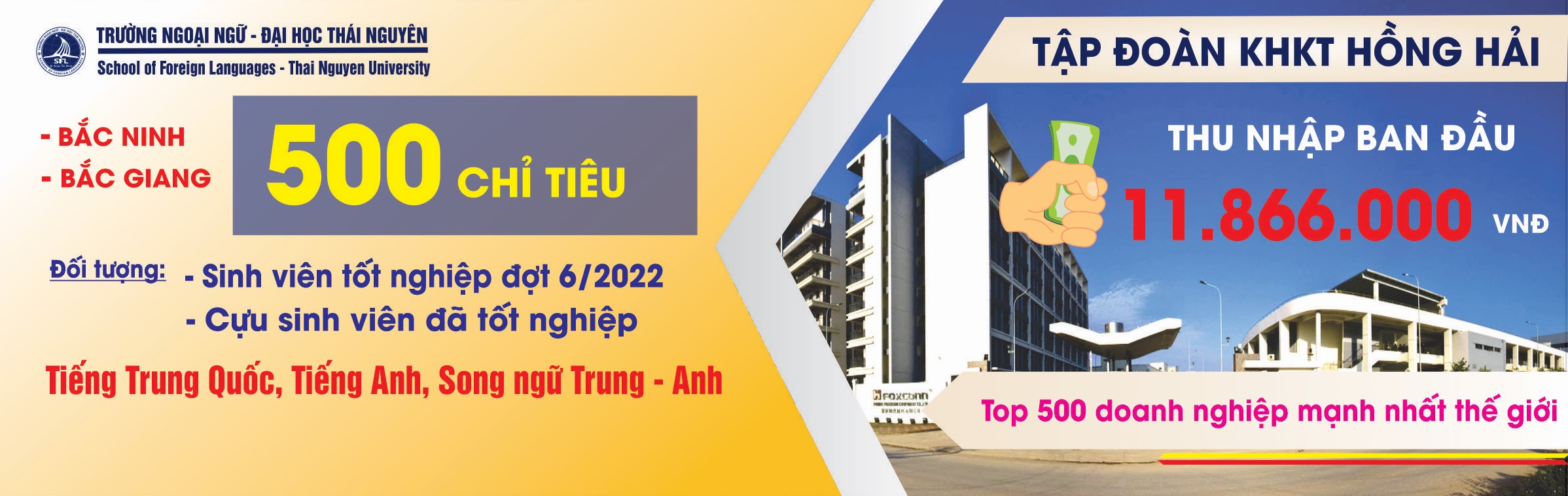 Căn cứ vào nhu cầu mở rộng và phát triển của Tập đoàn Khoa học Kỹ thuật Hồng Hải Việt Nam, cùng với việc thúc đẩy tôn chỉ “Nâng cao Khoa học kỹ thuật, đào tạo nhân tài và bản địa hóa nhân tài để phát triển lâu dài”. Năm nay, Tập đoàn Khoa học Kỹ thuật Hồng Hải Việt Nam đang có nhu cầu tuyển dụng 500 cán bộ nguồn chuyên ngành Tiếng Anh, Tiếng Trung, Song ngữ Trung Anh nhằm tăng cường vào đội ngũ cán bộ chất lượng cao của tập đoàn tại Việt Nam tại các cơ sở tập trung chủ yếu tại Bắc Ninh, Bắc Giang.
